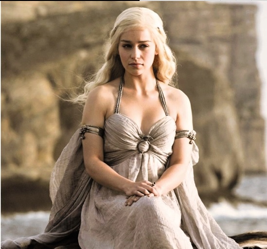 In the TV series she is played by actress Emilia Clarke. In the TV series she has long white wavy hair that is often styled in a fantasy medieval way. use I am going to use this as a big inspiration in my hair styling. I have also decided I will take inspiration from her wedding dress in terms of costume.